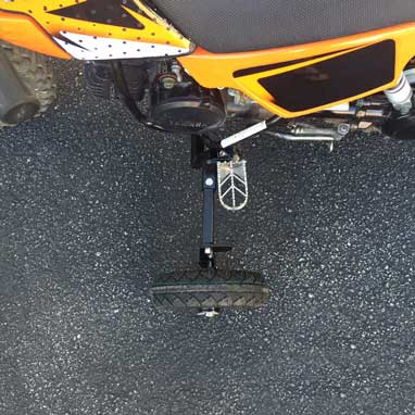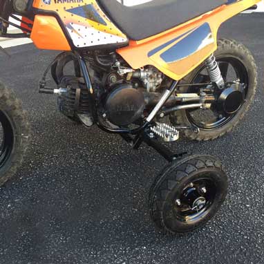 This made in U.S.A. training wheel kit is specifically designed for the PW50 and offers stability to ensure your child won't fall over; it also can help teach proper balance. The kit is built in the USA from heavy-duty tubular steel construction. As children learn to ride a real dirt bike for the first time, they need to feel safe. Unlike any other kit our training wheel kit is an adjustable wheel ride height, which allows parents to set the wheel height to match the rider's skill level. This allows beginning riders to feel safe or more advanced riders to turn corners sharper with increased speeds. Inflated 4" tires with inner Tubes are mounted on black powder coated steel rims. Adjustable ride height.