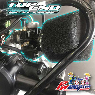 Dollar for dollar the biggest power gain! This bolt on carb kit increases power all across power curve and its quick and easy to assemble. Stock Yamaha PW50 engine or full modified PW50 with big bore 60cc cylinder, this carb kit would be a huge advantage over stock OEM carburetor. Top End Machine alloy intake manifold and Black Dragon race carburetor are designed and scaled to fit PW50 frame and engine without hanging out or interfering with rider’s leg.