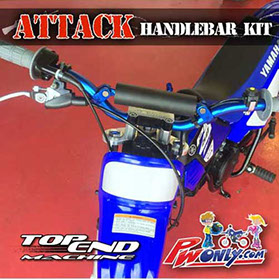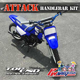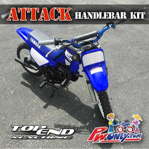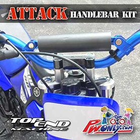 Transform your PW50 with this bolt on PW50 TOP END MACHINE Attack Handlebar Kit. Ride with better handling and control with proper motocross form. Straighter bend and slightly taller and wider than stock OEM handlebars. NIGHT AND DAY difference guaranteed to be the coolest thing you can buy for all year PW50s.
